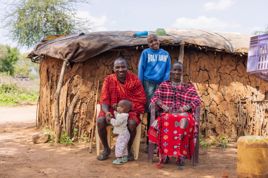 A portrait of the Musheki family with dad Musheki Saidimu, 40, Mum Pilale Musheki, 30 and daughter Joan Naneu, 11 outside their homestead in Maparasha Location, Kajiado. © Amref Health Africa / Sarah Waiswa